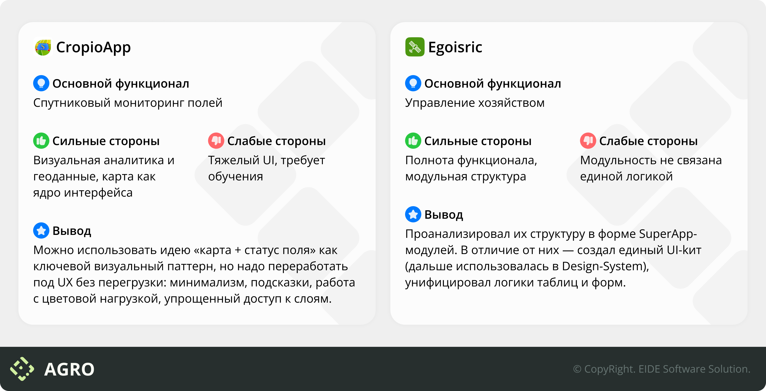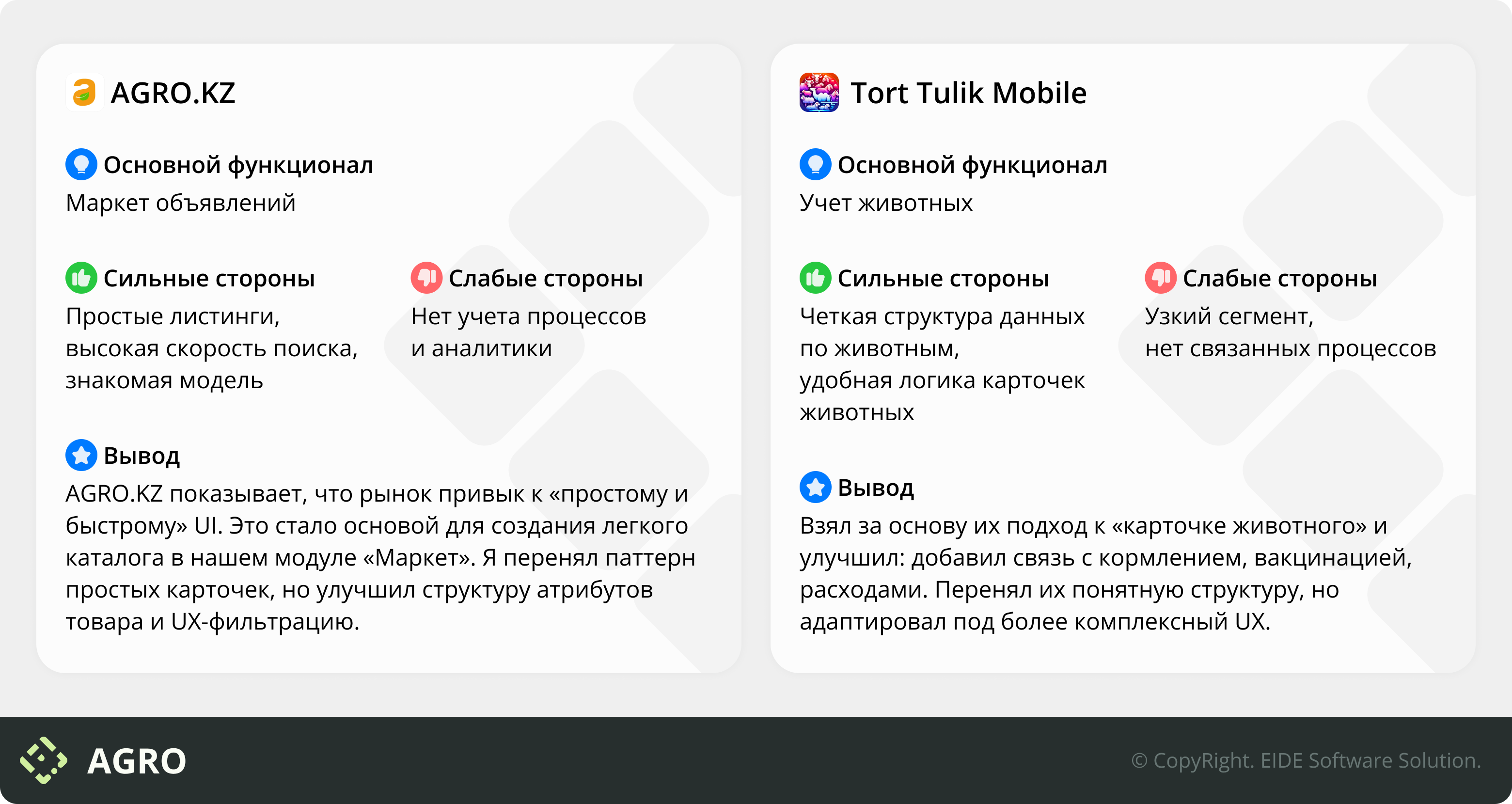 Во время анализа рынка я понял что, рынок агротеха в Казахстане (и не только, было изучено несколько мировых решений) фрагментирован: каждый сервис закрывает только по одной зоне задач фермеров. Полноценного SuperApp, который объединяет поля, скот, технику, склад и продажи - не существует. Это создаёт высокую точку входа для нового комплексного продукта. На экранах ниже показал сравнительный анализ со всех приложении чьи паттерны можно считать как за конкурентов: