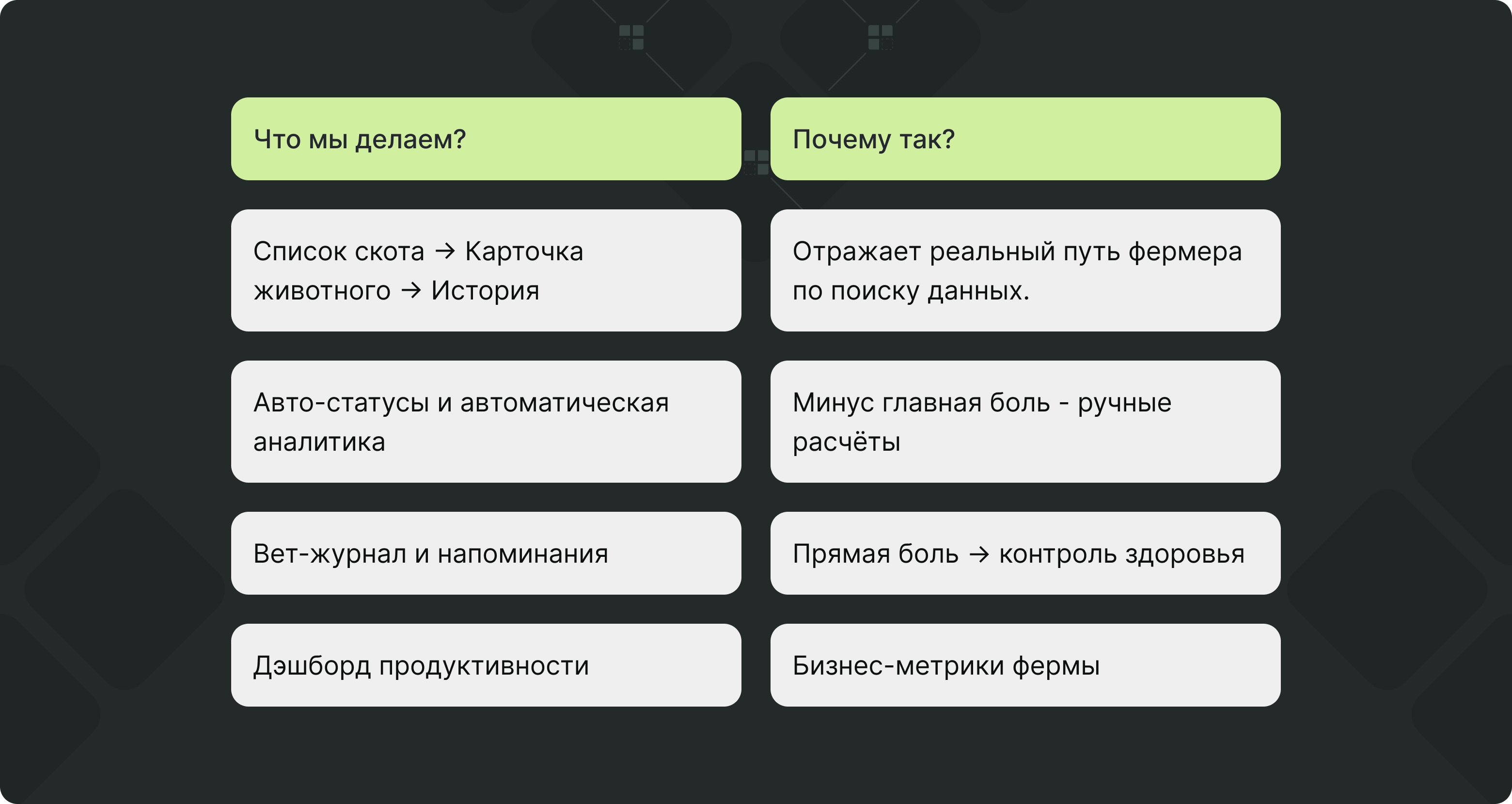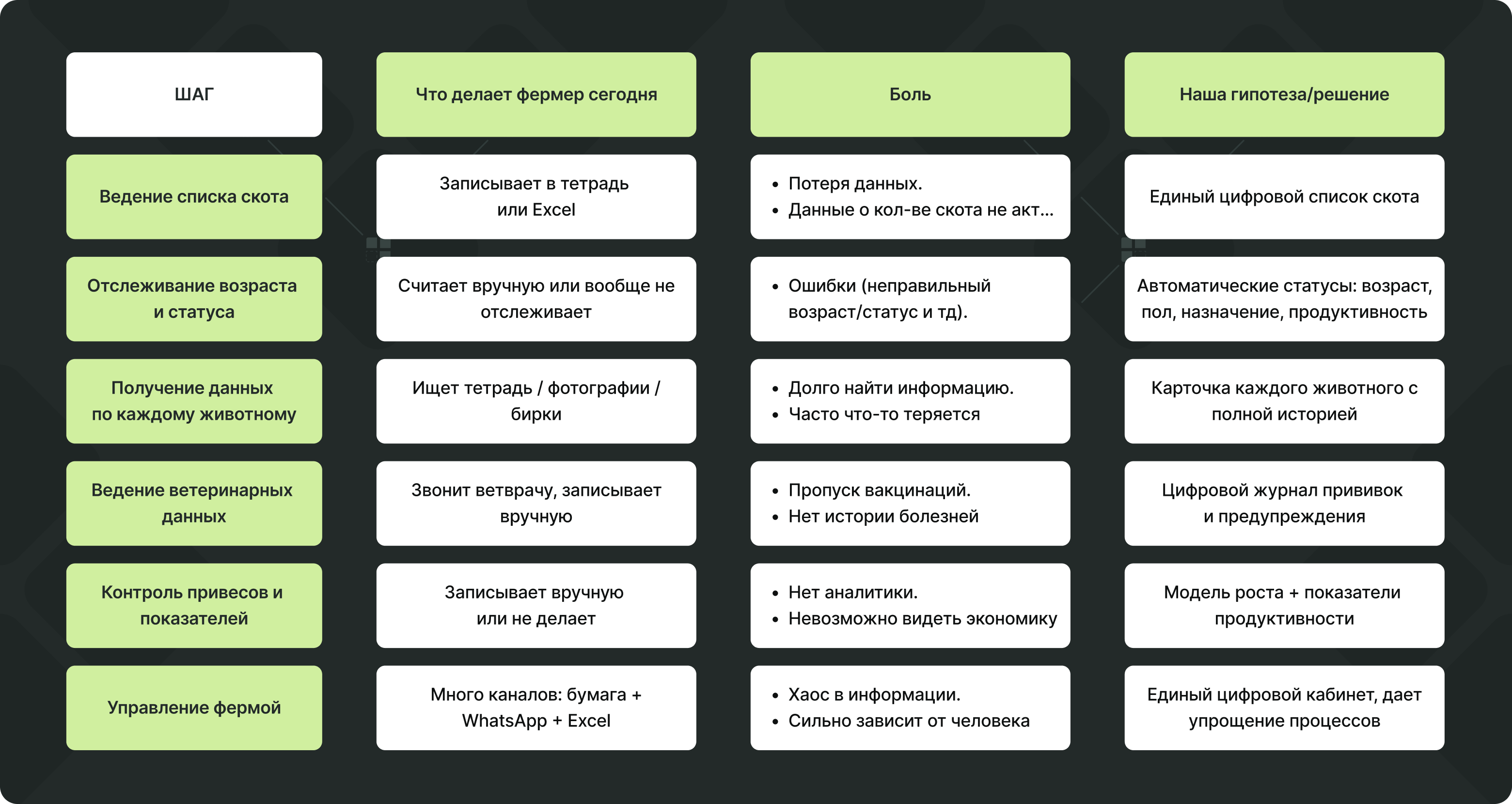 После анализа конкурентов у меня сформировались первичные гипотезы. Чтобы проверить их и глубже понять реальные боли, мы совместно с PM подготовили опрос для фермеров и агрономов. Это помогло уточнить ключевые проблемы и подтвердить направления для дальнейшей работы. Дальше чтобы показать глубину анализа выберу один из сервисов(Скот) и на нем буду дальше показывать всю проделанную работу.